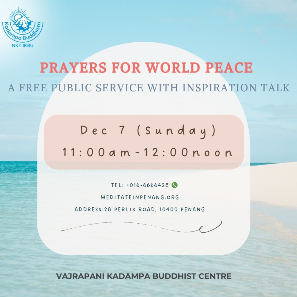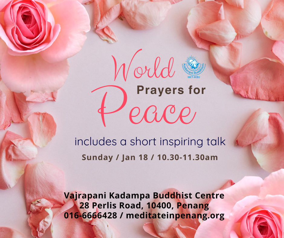 Prayers for World Peace is a free class that gives us the opportunity to develop a warm and loving heart. The class includes a Dharma talk, meditation and short prayers.