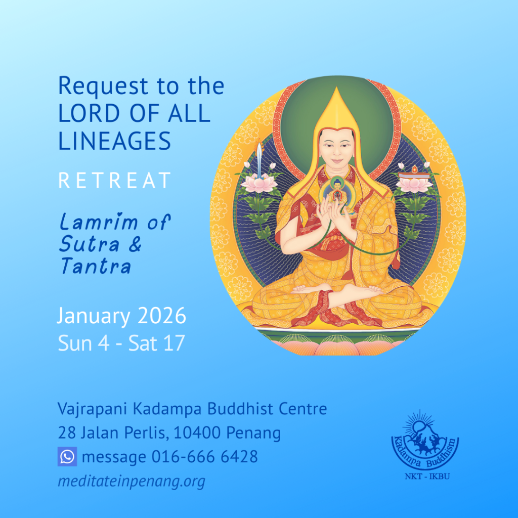 REQUEST TO THE LORD OF ALL LINEAGES RETREAT Sunday 4 to Saturday 17 January 2026 In this retreat we have the opportunity to contemplate and meditate on this very blessed prayer and allow the meaning of each verse to touch our heart. Through this our mind will transform into wisdom, cherishing love, compassion and so forth. As Venerable Geshe-la said, there is no greater meaning than engaging in this practice.