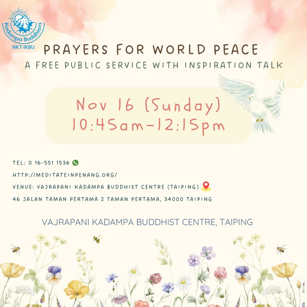 Prayers for World Peace is also held monthly on a Sunday morning. It includes inspiration Dharma talk and meditation.